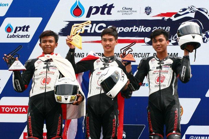 Buriram, Thailand – Muhammad Hildhan Kusuma berhasil mengibarkan bendera Merah Putih dari podium kedua disusul Herjun Atna Firdaus pada podium ketiga pada balapan kedua ajang Thailand Talent Cup (TTC) seri keempat yang berlangsung di Chang International Circuit, Buriram, Thailand. Prestasi ini melengkapi pencapaian Herjun yang berhasil meraih podium pertama pada balapan pertama.