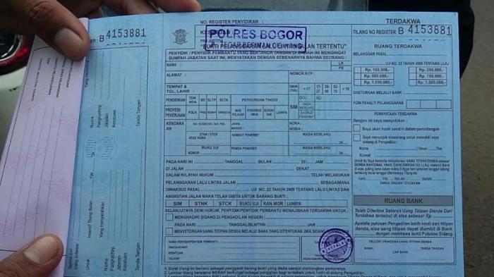 Nah, kalau pengemudi setuju dengan dakwaan penyidik artinya pelanggar tersebut akan menerima surat tilang berwarna biru yang berisi data diri pelanggar, data kendaraan, data polisi lalu lintas yang menilang, besarnya denda, dan juga peraturan yang dilanggar. Setelah pelanggar peraturan melakukan pembayaran di Bank, pelanggar bisa membawa bukti pembayaran tersebut ke kesatuan polisi yang menerbitkan surat tilang untuk mengambil STNK ataupun kendaraan yang ditahan.