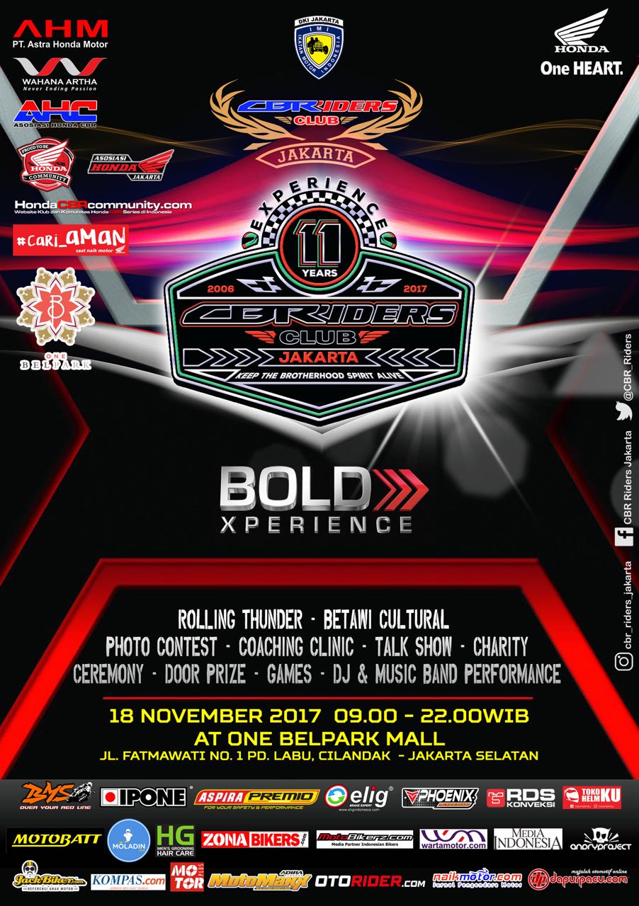 “EXPERIENCE 11 YEARS” adalah tema event Anniversary CBR Riders Jakarta yang ke 11 tahun, yang mengungkap kisah perjalanan selama 11 tahun berdiri, sehingga momentum ini sangat nantikan oleh anggota/member CBR Riders Jakarta. Dan tepat pada hari ini tanggal 15 November 2017 CBR Riders Jakarta memasuki usia ke 11 tahun, perayaan serta seremoni HUT ke 11 tersebut akan diadakan pada tanggal 18 November 2017 di One BelPark Jl RS Fatmawati No. 1 Jakarta Selatan.