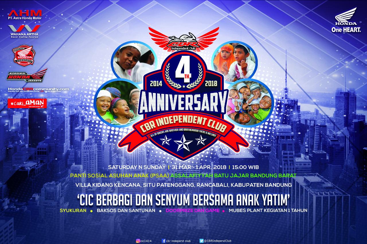 Tema “CIC Berbagi dan Senyum Bersama Anak Yatim Piatu” merupakan serangkaian acara yang diadakan untuk merayakan 4th Anniversary Honda CBR Independet Club. Acara ini di gelar sebagai rasa syukur di hari jadi CIC yang ke- 4 serta untuk mempererat tali persaudaraan antar sesama. Dan juga sebagai wujud eksistensi sebagai komunitas biker pecinta otomotif terutama Honda CBR yang tergerak sampai saat ini dan akan berjalan ketahun-tahun berikutnya.