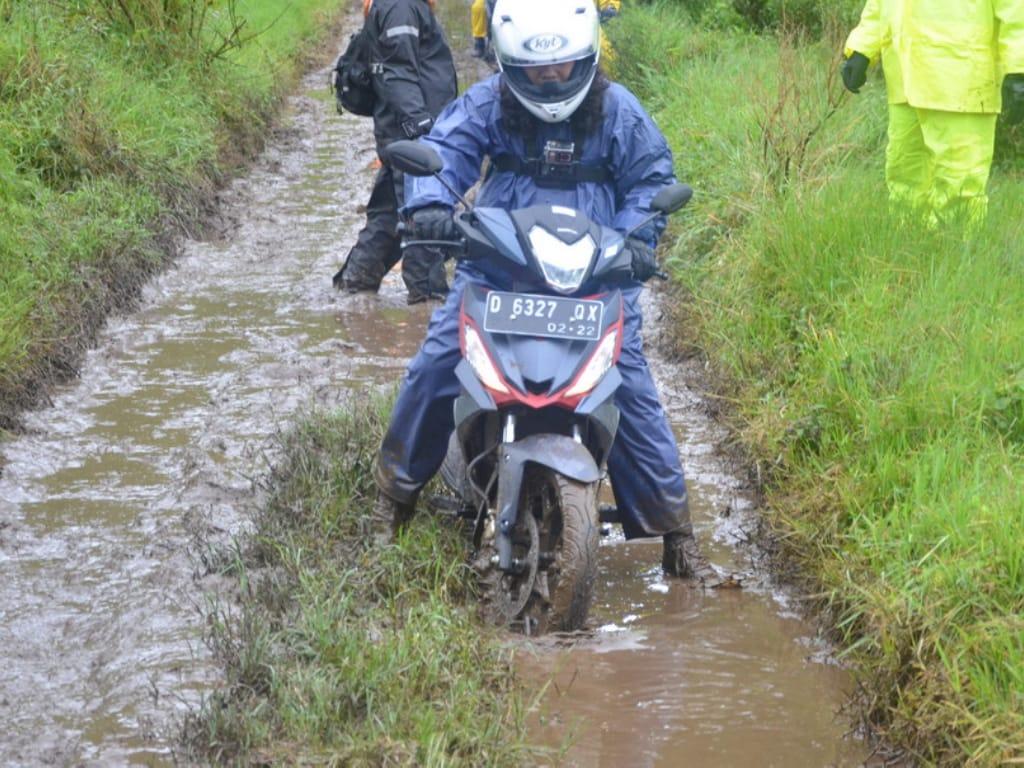 Jika masih kesulitan, pengendara bisa turun kemudian mendorong sepeda motor sampai keluar dari jebakan lumpur.