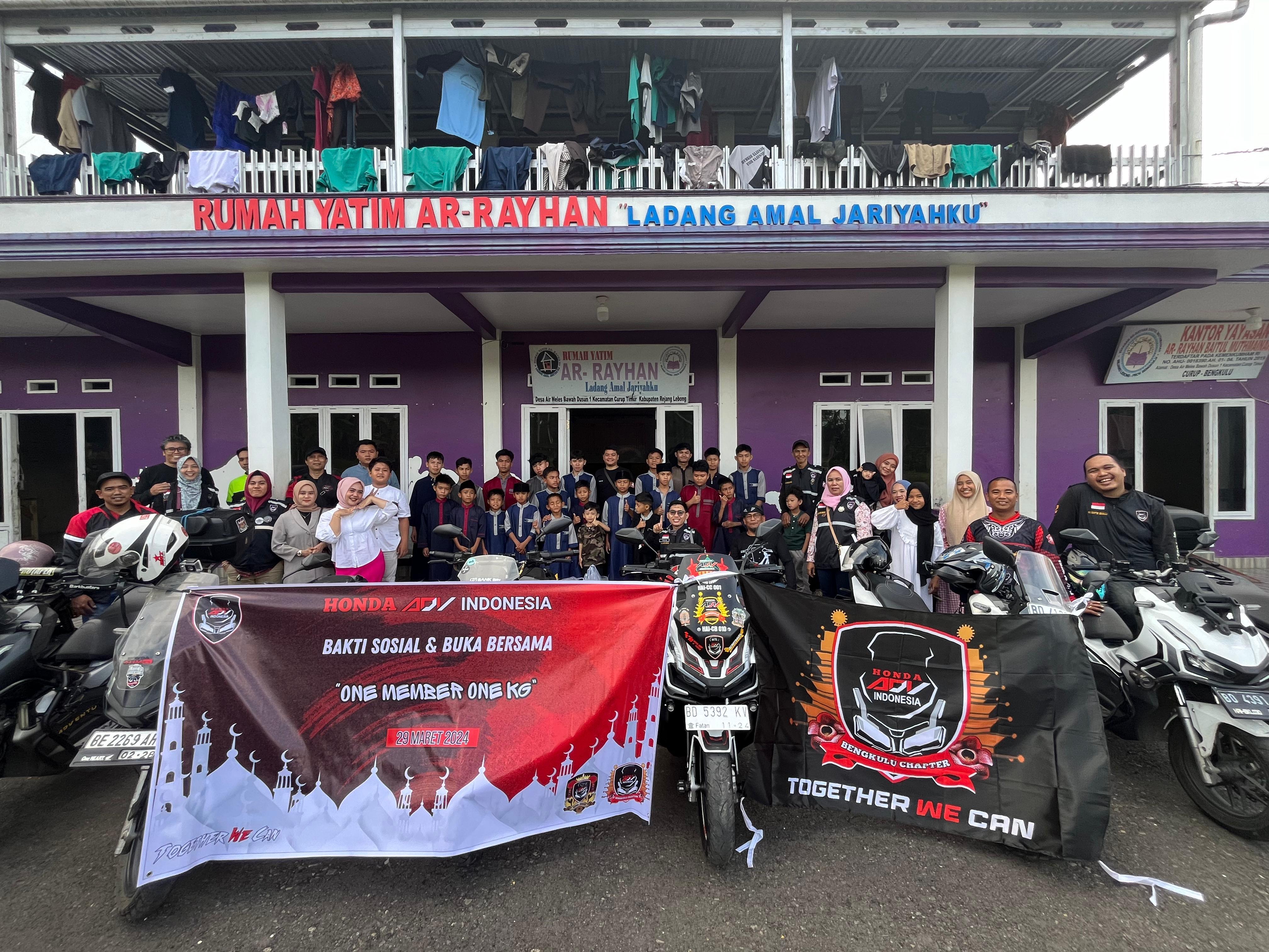 BENGKULU, - Salah satu agenda dalam rangkaian Anniversary Honda ADV Indonesai (H.A.I) Chapter Bengkulu ke 4 tahun yang berpusat di Kota Curup, Kabupaten Rejang Lebong. Kemarin ini adalah dengan menyantuni anak yatim. Sebelum menggelar acara puncak para pengurus dan anggota H.A.I Chapter Bengkulu menyalurkan bantuan atau menggelar Bakti Sosial (Baksos) di Rumah Yatim Ar - Rayhan "Ladang Amal Jariyahku" yang beralamatkan di Desa Air Meles Bawah Dusun I, Kecamatan Curup Timur, Kabupaten Rejang Lebong.