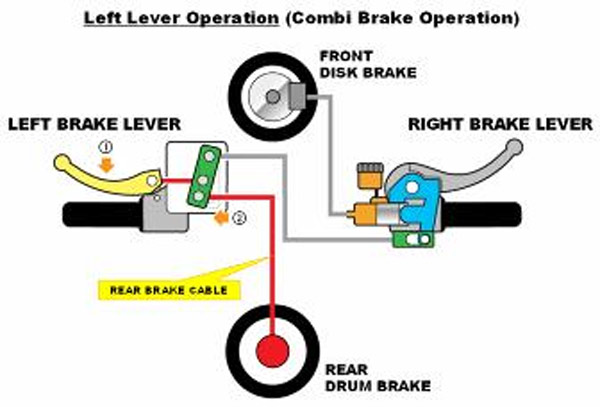 Jika dilihat secara detail, pada tuas rem kiri atau rem belakang terdapat equalizer bercabang dua. Dimana satu kabel mengarah langsung ke rem balakang dan satu kabel lainnya ke kabel konektor tadi. Kabel konektor akan menarik knocker dan mendorong piston hidrolik yang ada di master rem depan.