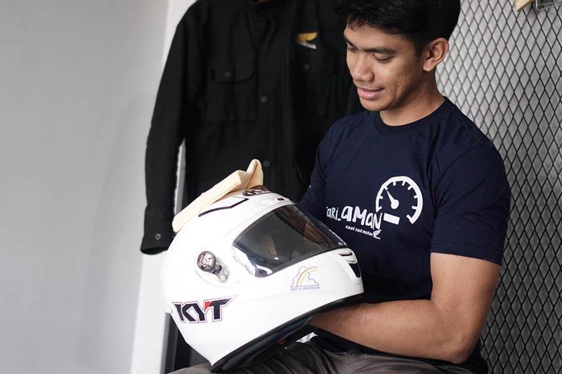 2. Untuk helm sebaiknya di lap dan dibersihkan dahulu terutama bagian kaca agar tidak ada kotoran yang menempel yang pada akhirnya dapat menyebabkan kaca menjadi berjamur. “Untuk bagian dalam dari helm yang bisa dibuka sebaiknya dijemur dan dibersihkan agar kering dari keringat sehabis riding,” jelas Ludhy.