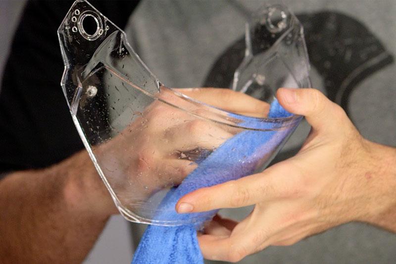Setelah langkah-langkah sebelumnya sudah Brader lakukan, berikutnya Brader hanya perlu membilas kaca helm tersebut menggunakan air bersih dan mengelapnya sampai benar-benar kering. Tujuannya agar kaca helm tidak lembab dan bekas air yang dibasuhkan tadi tidak membekas.
